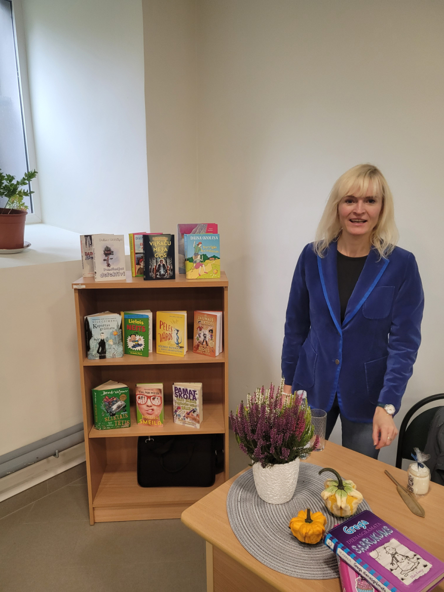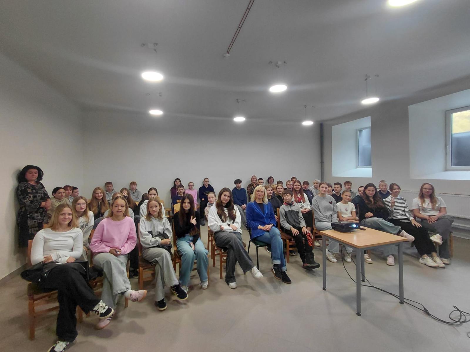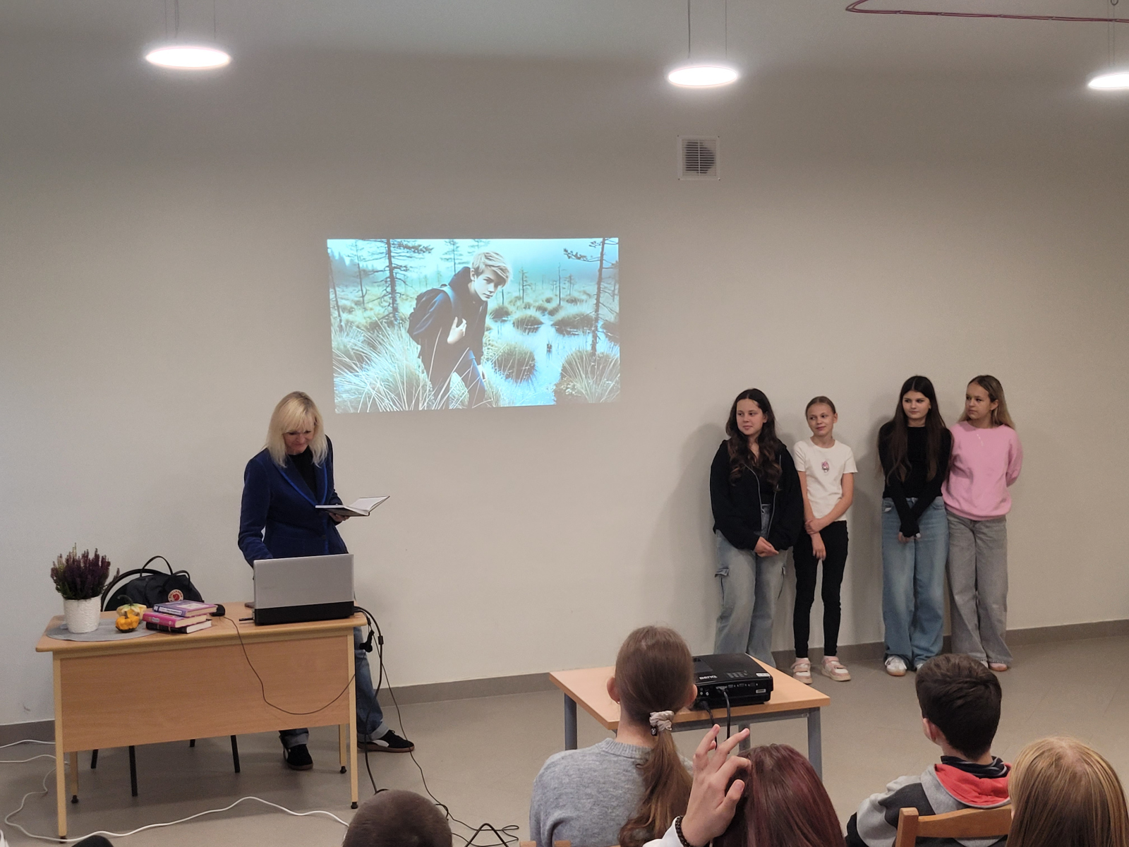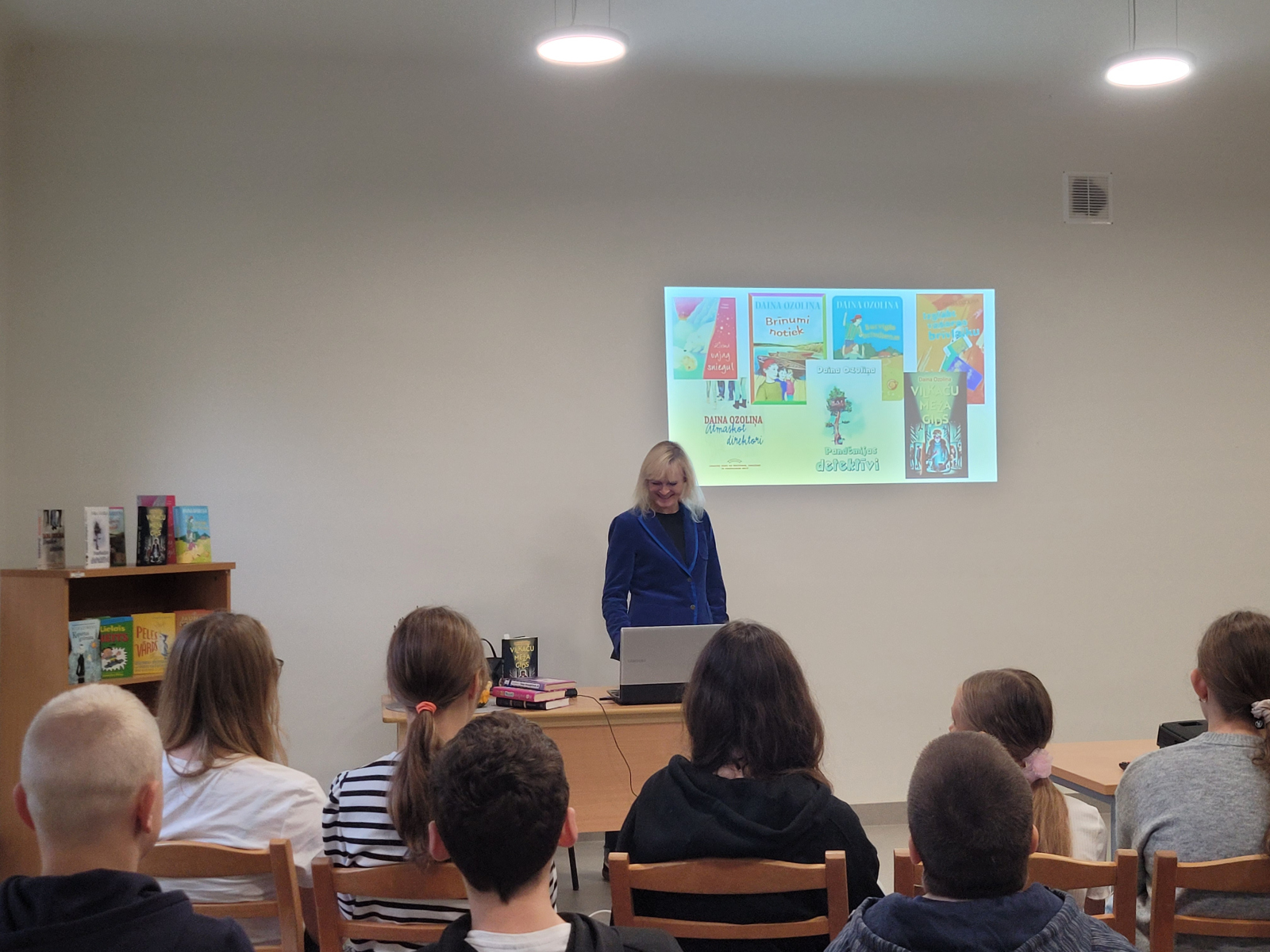 7.klašu izglītojamie tikās ar rakstnieci, skolotāju, tulkotāju un teātra sporta treneri Dainu Ozoliņu. Viņa ir aktīva kultūras un sabiedrisko notikumu organizētāja un dalībniece, kura ar savu radošumu un dzīvesprieku iedvesmo gan jauniešus, gan pieaugušos. Daina Ozoliņa tulko populāras bērnu un jauniešu grāmatas no angļu valodas. Viņas tulkojumu vidū ir iemīļotās sērijas „Grega dienasgrāmata”, „Nikijas dienasgrāmata”, grāmatas par Lielo Neitu, kā arī darbi no tādiem autoriem kā Džeimss Patersons, Deivids Valjams, Lemonijs Snikets un citi. Tikšanās laikā rakstniece stāstīja par savu darbu, par to, kā top tulkojumi, un par prasībām, kas nepieciešamas, lai valodu pārvērstu stāstā, kas aizrauj lasītāju. Dainas Ozoliņas rakstīšanas stils ir viegls un asprātīgs, tajā prasmīgi iepīti jauniešu ikdienas piedzīvojumi, problēmas un sociālo tīklu sarunas, kas raksturīgas mūsdienu komunikācijai. Skolēniem bija iespēja piedalīties interesantā aktivitātē – izdomāt savu grāmatas sižetu, ļaujot vaļu iztēlei un radošumam. Šī nodarbe raisīja daudz smieklu, pārdomu un radošu ideju.
