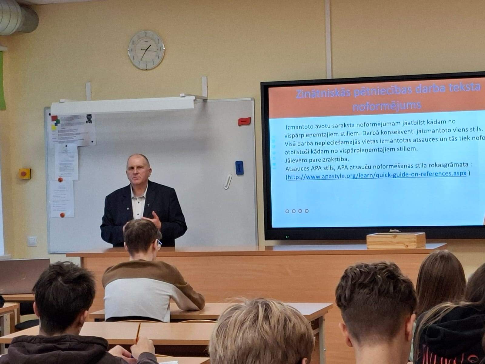 Vidzemes Augstskolas absolventu attiecību koordinators, starptautiskā moduļa vadītājs, lektors Ilgvars Ābols vadīja ļoti vērtīgas, izglītojošas nodarbības par zinātniski pētniecisko darbu rakstīšanu. Skolēniem tika sniegti padomi, kā precīzi izvēlēties tēmu, izvirzīt mērķi un uzdevumus, kā rakstīt un noformēt darbu. Tika sniegti padomi, kā veiksmīgi uzstāties un prezentēt darbu. Ikvienam skolēnam noslēgumā tika nodrošinātas individuālas konsultācijas.