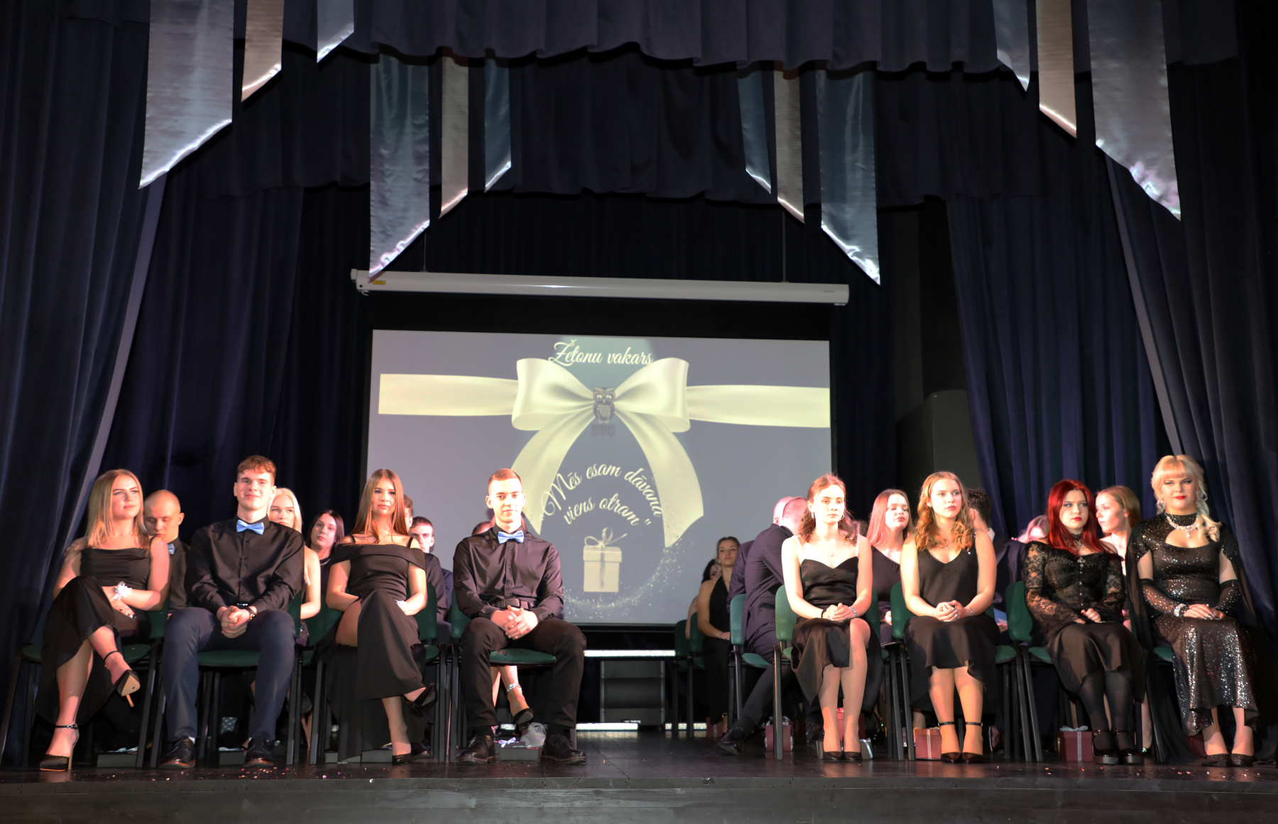 Klātesošie izbaudīja 12.a un 12.b klases jauniešu sagatavotos priekšnesumus, kuros piedalījās arī klases audzinātājas. Varam secināt, ka abiturienti ir patiesi apdāvināti, radoši un talantīgi, un viņi rūpīgi gatavojuši priekšnesumus, kas nebeidza pārsteigt. Sajūsmu izraisīja arī abiturientu īpaši veidotā pirmā deja. Neizpalika arī skolas skaistā tradīcija – kopīgi dziedāt skolas himnu Žetonu vakarā un dejot Balvu valsi.