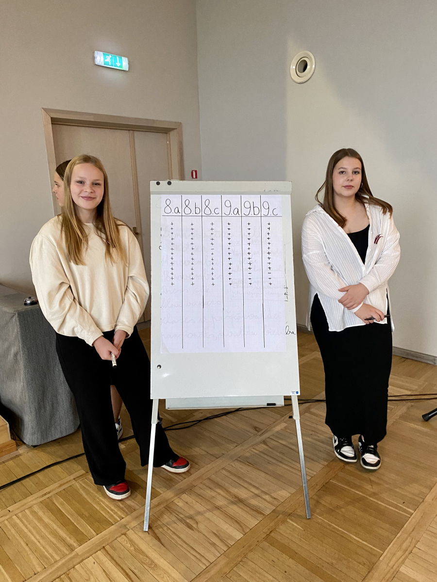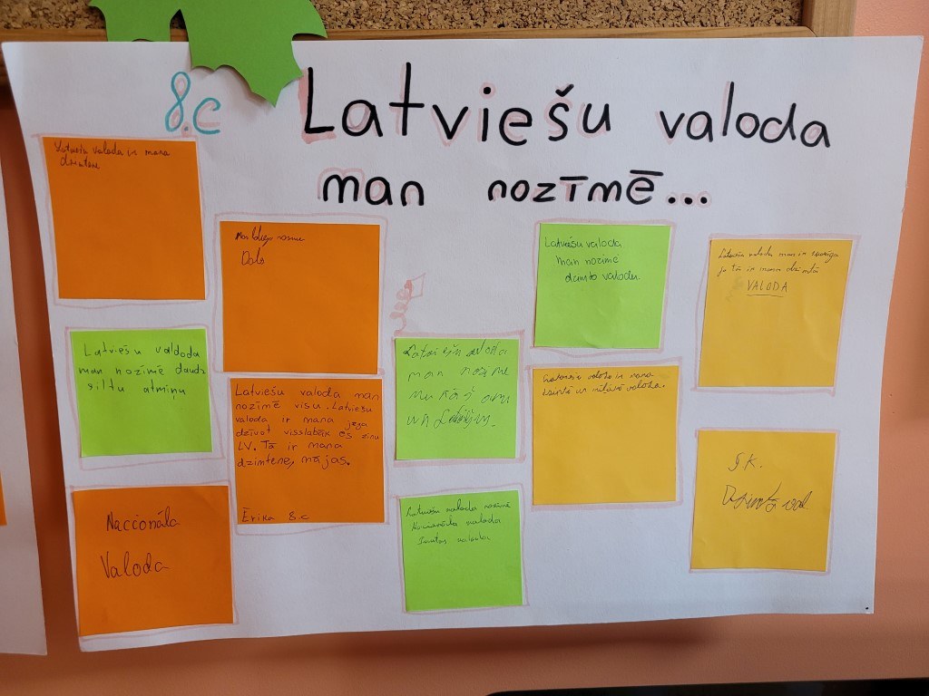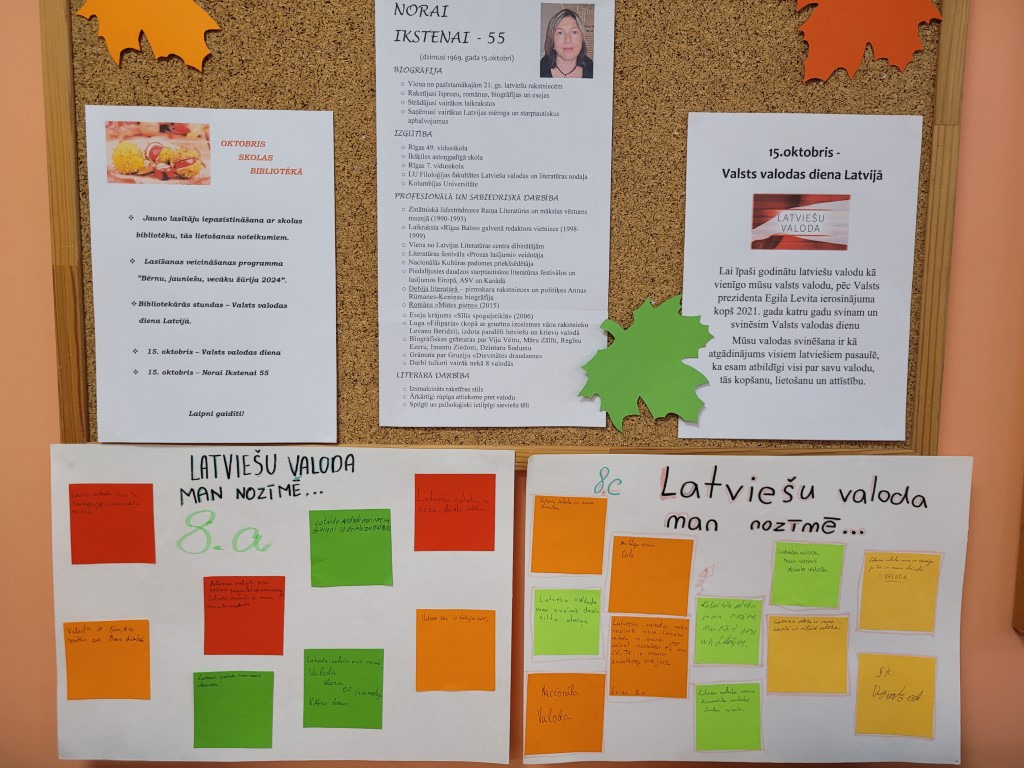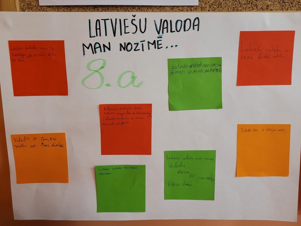 Atzīmējot Valsts valodas dienu, skolas bibliotēkā tika piedāvātas izglītojošas bibliotekārās stundas, kurās piedalījās 8.a un 8.c klašu izglītojamie. Tās ietvēra dažādas aktivitātes, kas veicināja izpratni par valsts valodu. Skolēni noskatījās filmiņu “Valsts valodas stāsts”, uzzināja par nozīmīgiem latviešu rakstniekiem un viņu ieguldījumu valodas attīstībā. Noslēgumā katrs izglītojamais uzrakstīja pārdomas par to, ko katram nozīmē latviešu valoda, un apkopoja plakātos “Latviešu valoda man ir…”.