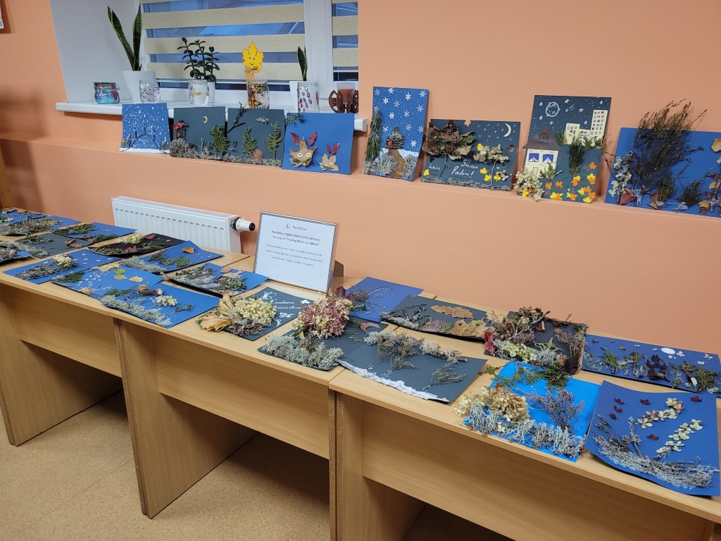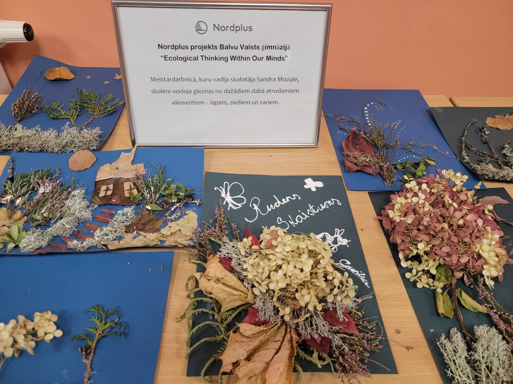No 25.oktobra līdz 5.novembrim skolas bibliotēkā bija iespēja apskatīt Nordplus projekta „Ecological thinking within our minds” ietvaros veidotās skolēnu gleznas no dažādiem dabā atrodamiem elementiem – lapām, ziediem un zariem.