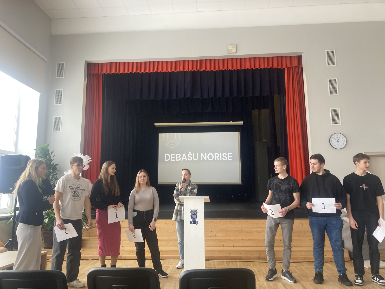 Ceturtdien jaunieši izlozēja tēmu un klasi, ar kuru sacentīsies debatēs, un sāka rūpīgi gatavoties sarunu cīņām. Piektdienas rīts bija spraigu sarunu piepildīts, jo aktu zālē notika “Milžu cīņas” jeb debašu turnīrs starp klasēm, bet skatītājiem ar aplausu skaļumu bija jābalso par veiksmīgākajiem debatētājiem. Šajā sacensībā uzvarētāji bija visi, jo katrs dalībnieks mācījās pārvarēt sevi, nepadoties un spraigi domāt, kā arī mācījās skaidri un cieņpilni izteikt savus argumentus, izteikt viedokli konkrētā laika rāmī un paraudzīties uz tēmu no pozīcijas un opozīcijas skatu punkta. Ceram, ka šīs aktivitātes daudzos jauniešos būs modinājušas interesi padziļināti izkopt debatēšanas prasmes, iesaistoties ģimnāzijas debašu pulciņā.