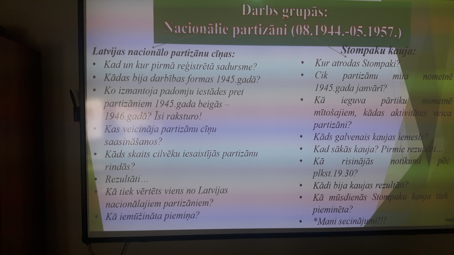 Temata tālākā apguvē skolēni, atbildot uz skolotājas darba lapās uzdotajiem jautājumiem, nostiprinot tekstpratību, pirmā grupa skolēnu, viens otram palīdzot, pastāstīja, kāpēc un kad izveidojās pirmās nacionālo partizānu grupas pēc 2.pasaules kara, kādas akcijas viņi veica, cik aptuveni iedzīvotāju iesaistījās partizānu kustībā, kādi bija rezultāti. Otrās grupas skolēni izdales tekstā meklēja atbildes uz jautājumiem, kur atrodas Stompaki, cik partizānu mita partizānu mītnē 1945.gada janvārī, kāds bija kaujas iemesls, kāds rezultāts un vēsturiskā nozīme, kā iemūžinātas partizānu cīņas mūsdienās.