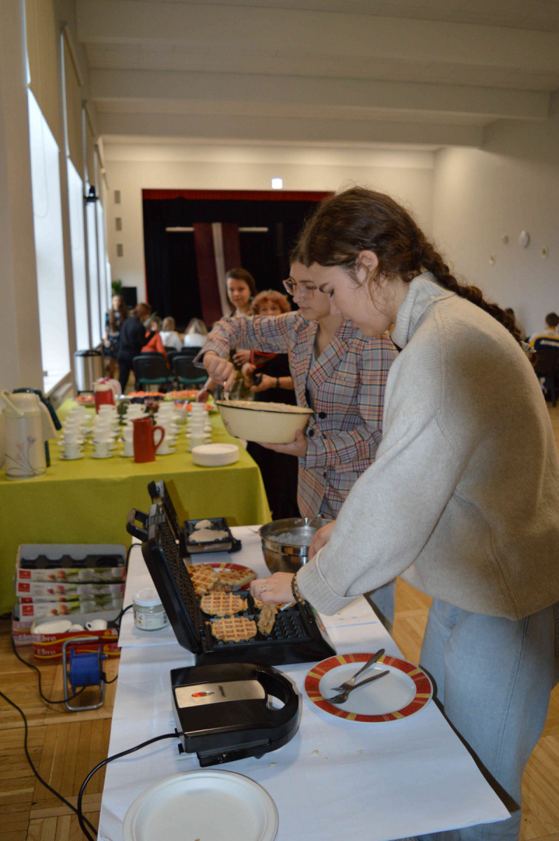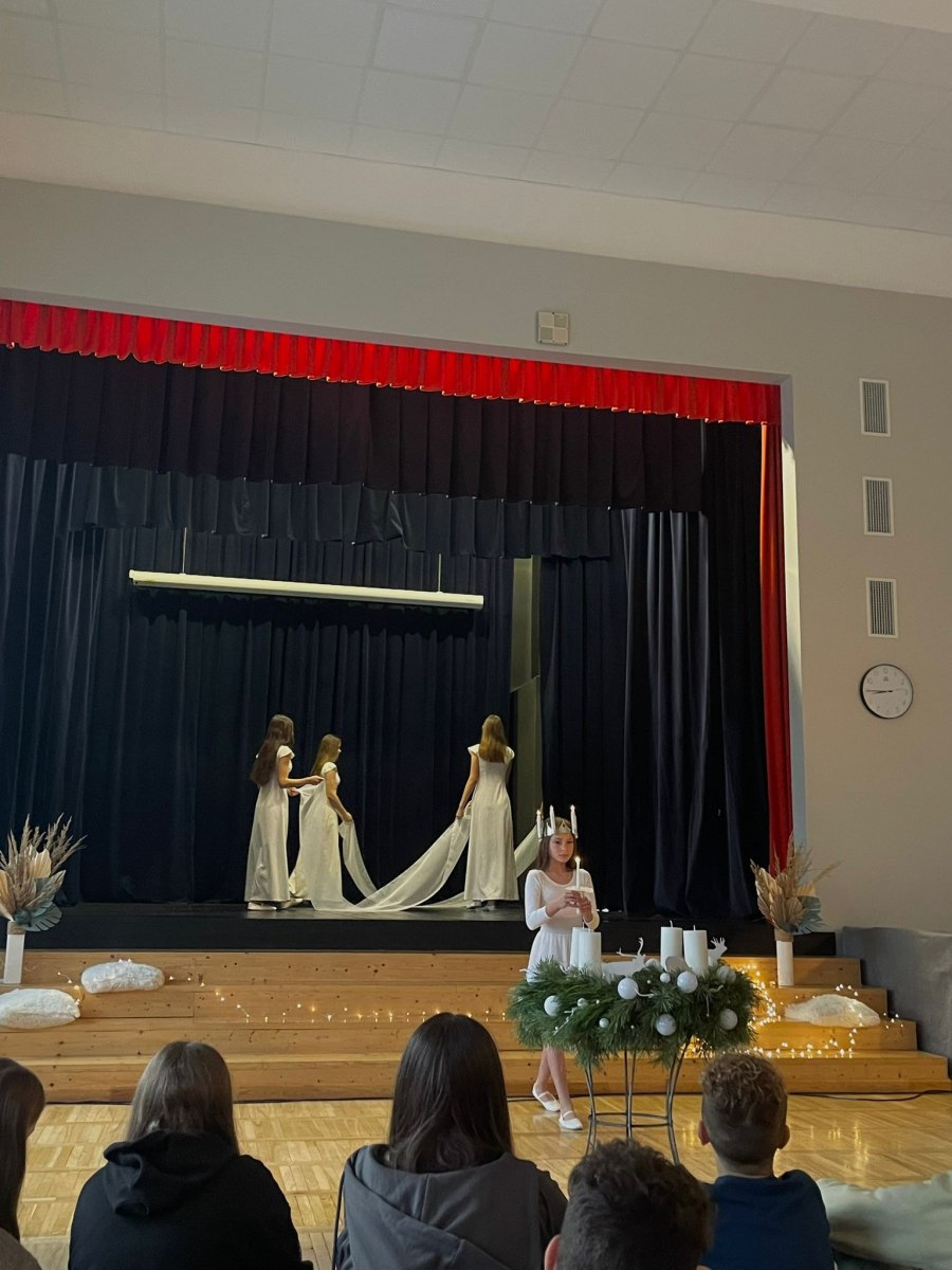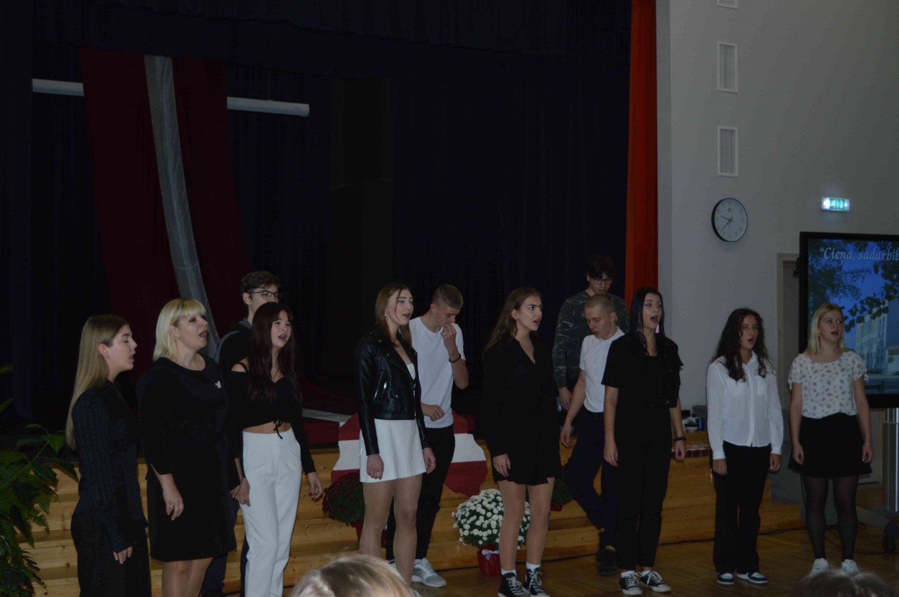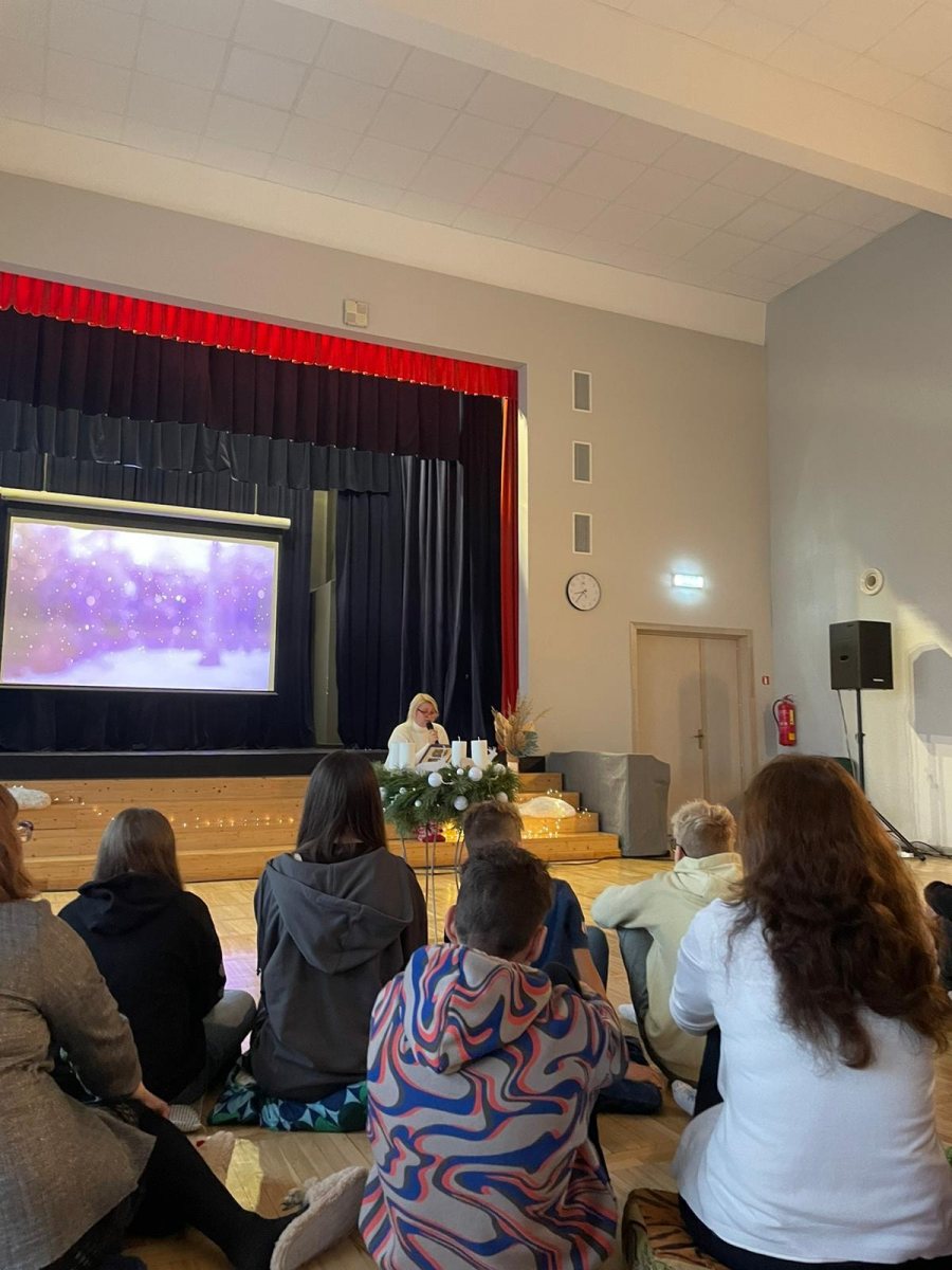 Pirmdien skolas aktu zālē pulcējās skolēni, skolotāji, tehniskie darbinieki un vecāki, lai kopā iedegtu pirmo Adventes svecīti