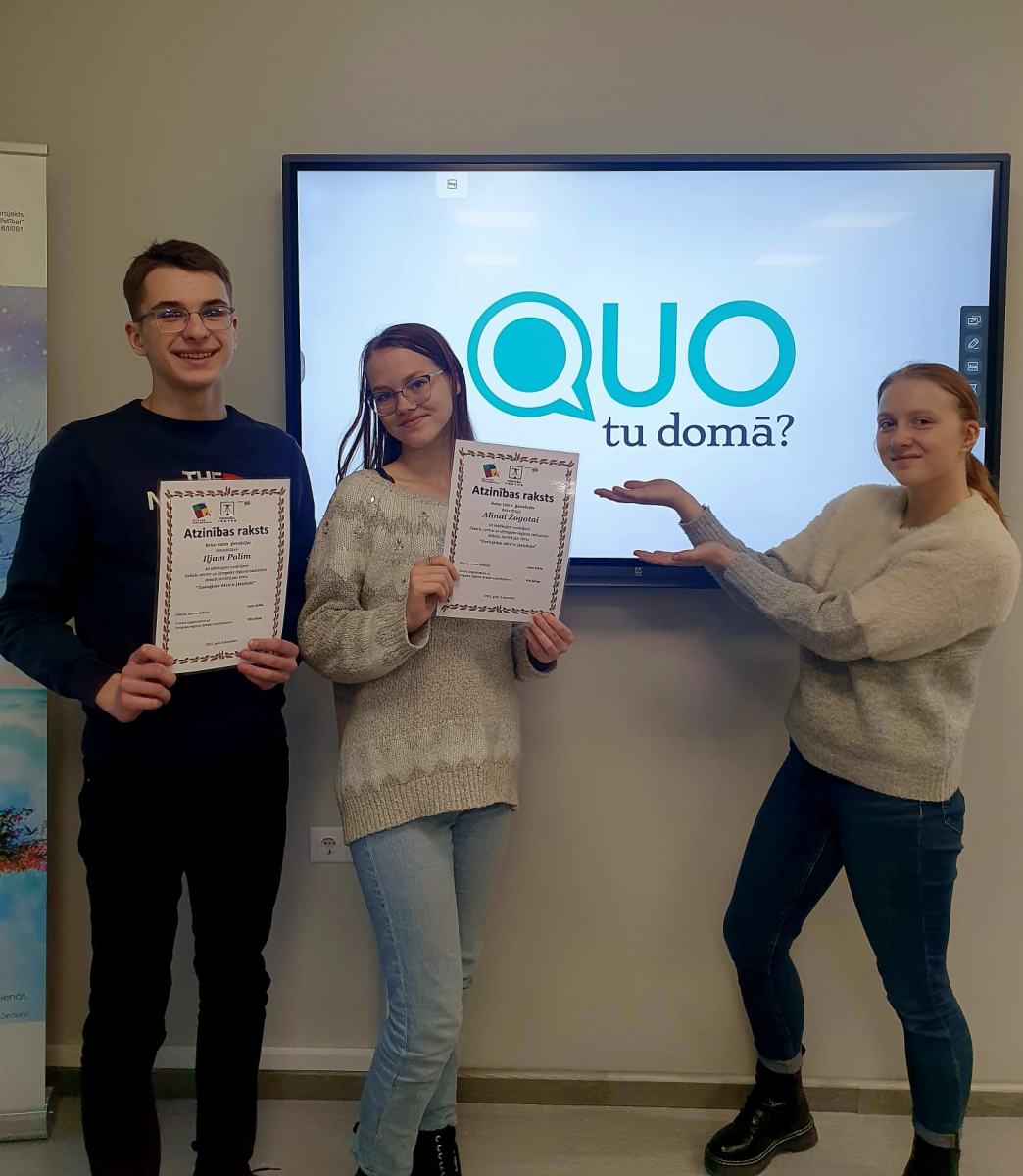 Latgales reģiona debašu centru un Balvu Valsts ģimnāzijas Debašu pulciņu pārstāvēja 9.a klases skolēnu komanda – Iļja Polis, Alīna Žogota un Nadīna Līva Logina.
