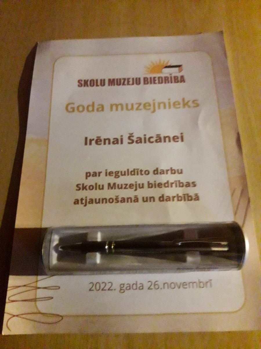 Arī Balvu Valsts ģimnāzijas skolas muzeja vadītāja Irēna Šaicāne saņēma šo goda muzejnieka apbalvojumu. Katram apbalvojuma saņēmējam tika veltīti zīmīgi vārdi par viņu ieguldīto darbu Skolu muzeju biedrības atjaunošanā un darbībā. Skolotājai Irēnai, saņemot apbalvojumu, tika nolasīti šādi vārdi: